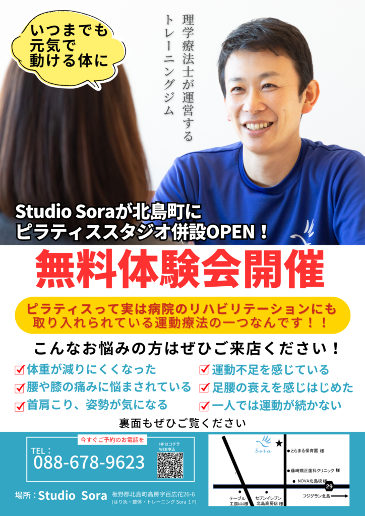 徳島県北島町のはり灸・整体・トレーニングSora(Studio Sora)では、11月限定で【トレーニング&ピラティス無料体験会】を開催します!